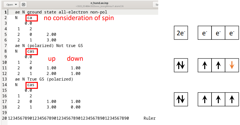 • cas : spin-polarized 계산 (각 오비탈 점유수를 up down 두 개로 입력) 1. 비편극(non-polarized) 스핀을 구분하지 않고 평균 점유로 계산